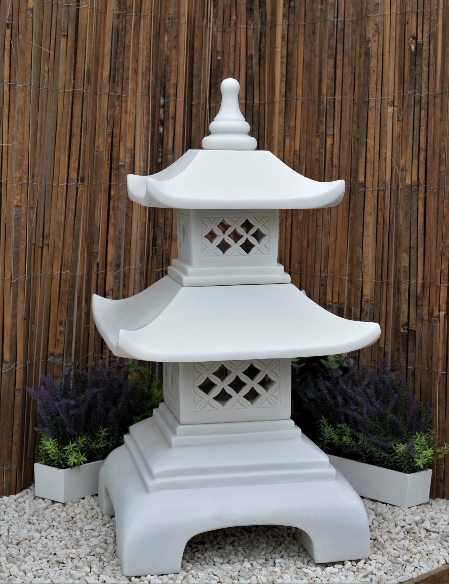 The 2 Tier Pagoda Garden Ornament in White is an elegant and commanding structure, designed to create a dramatic focal point in gardens, patios, or interior spaces.