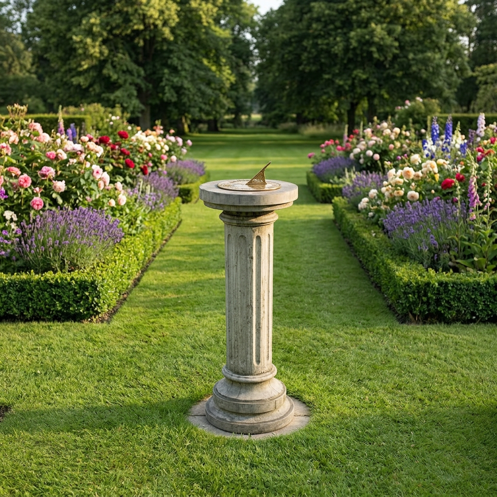 The Aged Brass Sundial on Brighton Stone Garden Pedestal stands 900mm tall. It makes a striking centrepiece for formal gardens, patios, and lawned borders.