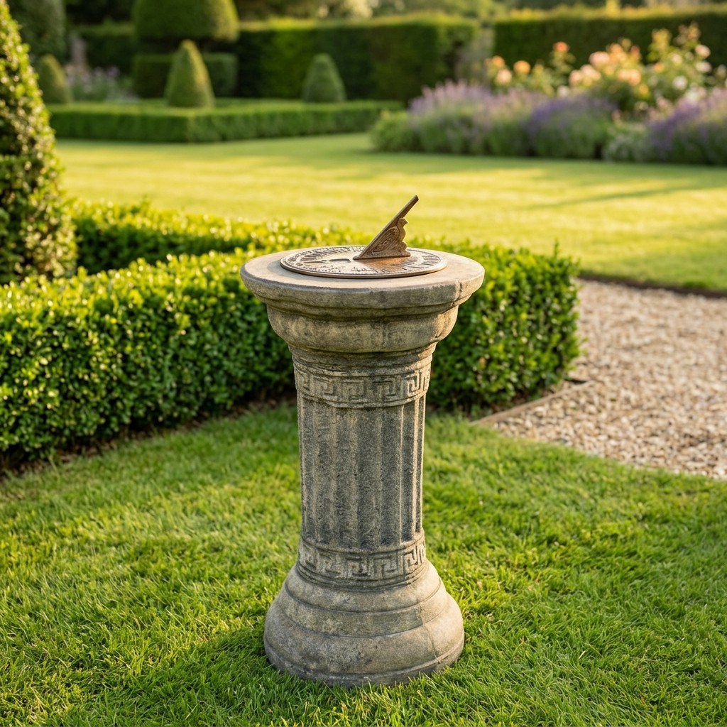 This is a proper garden sundial. The aged brass face sits on a stout fluted pedestal at just under 600mm tall, placing the dial at a comfortable reading height in a border or on a patio.