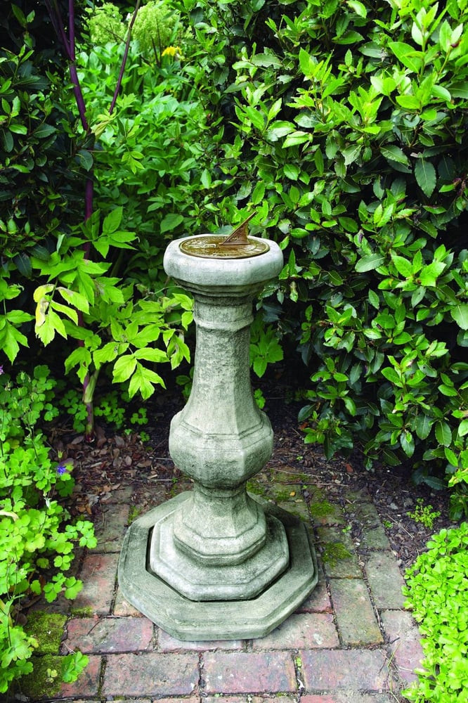An aged brass sundial plate sits on the flat top of the pedestal. The brass gnomon casts a shadow to tell the time on sunny days. It works as both a functional timepiece and a striking focal point.