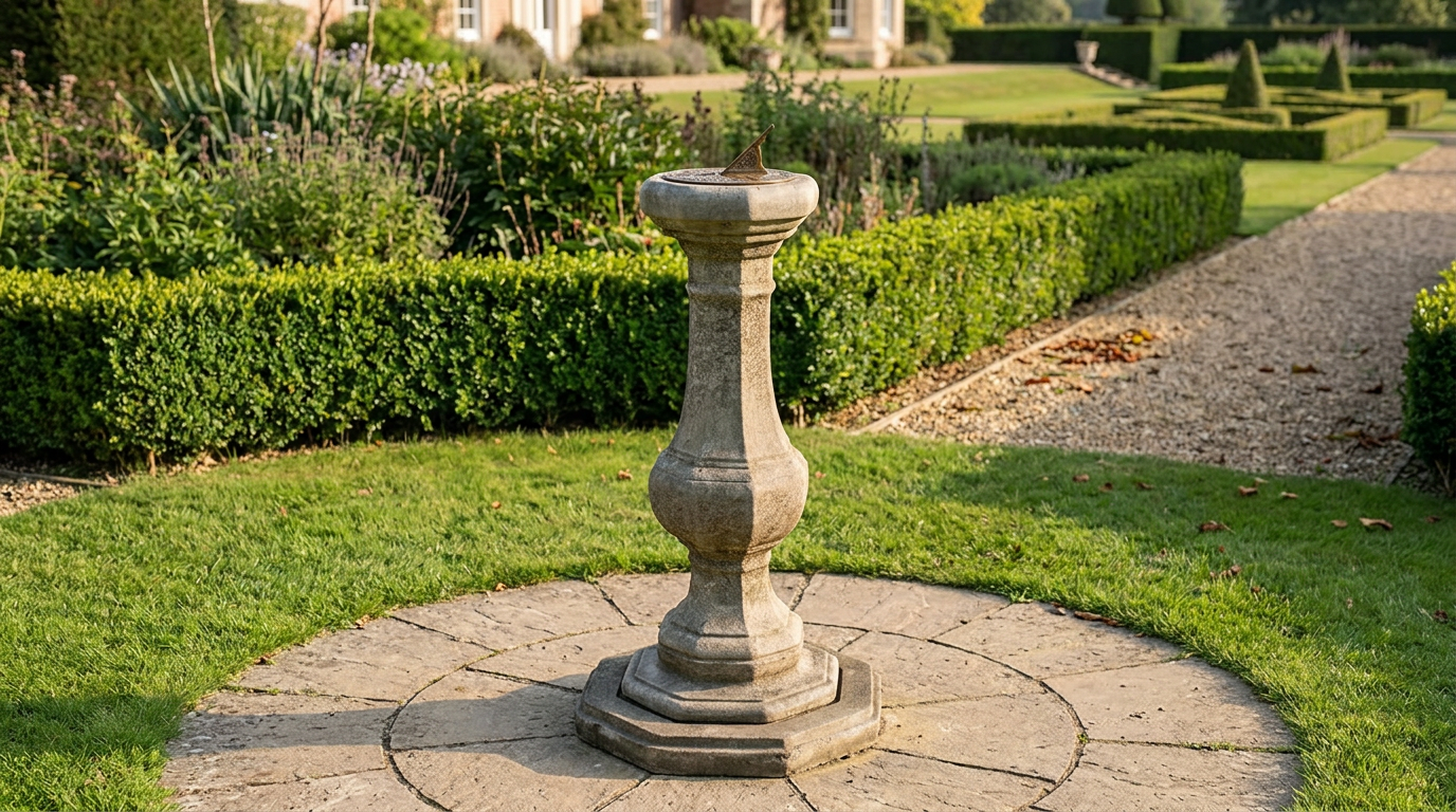 This handcrafted stone pedestal stands 980mm tall and arrives with an aged brass sundial already fitted. The cast stone finish develops character from day one.