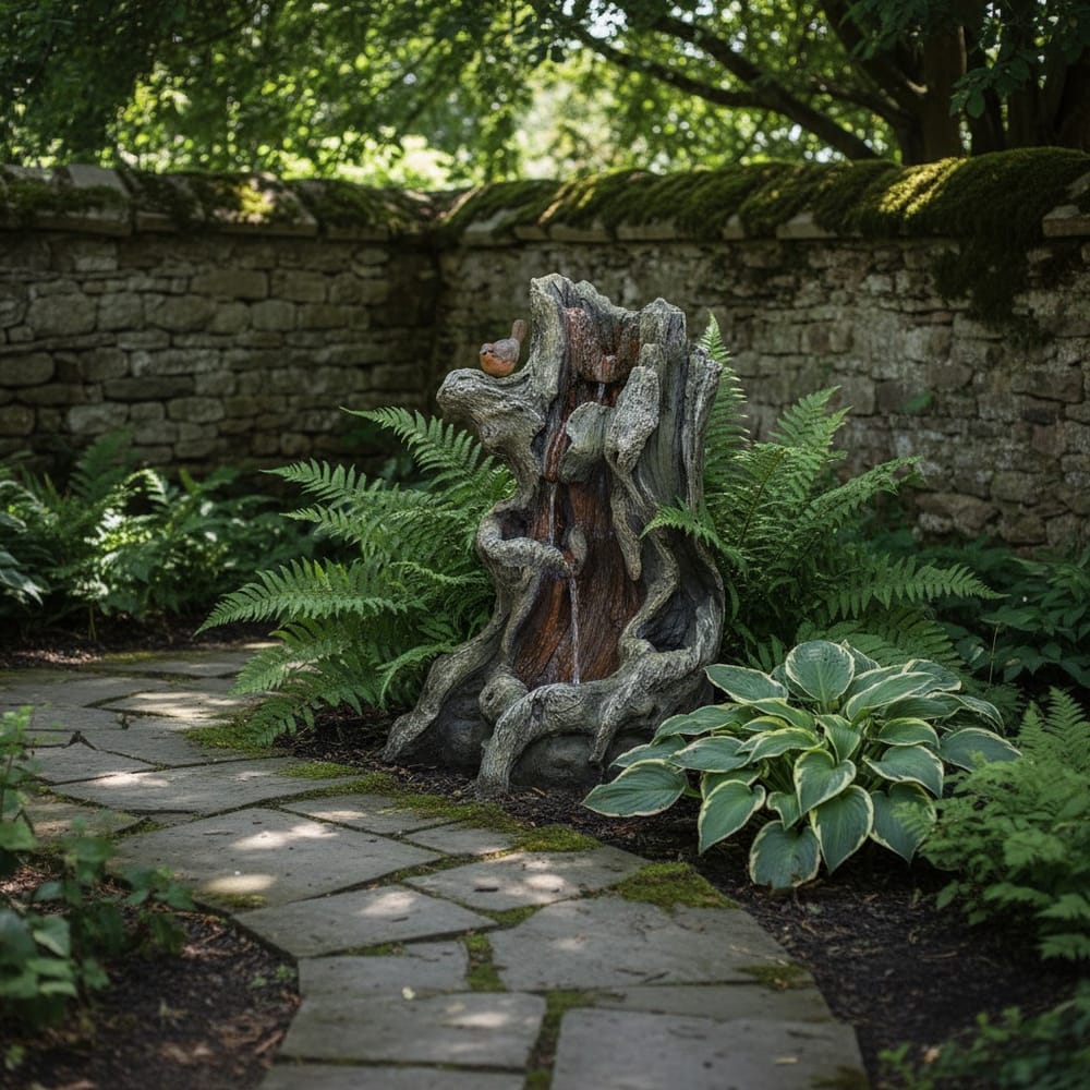 The Aged Willow Self Contained Water Feature recreates a gnarled tree trunk in rich, textured poly resin. Water cascades through three tiered pools carved into the weathered bark, while a small perched bird watches from above. At 275, it brings a woodland feel to any garden corner.
