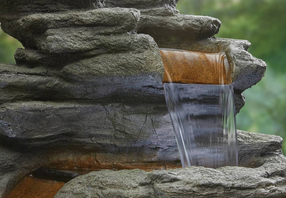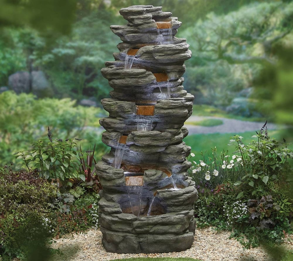 The Atlas Falls Stone Water Feature has a striking handpainted look with bright LEDS to highlight this unique feature for your garden.
