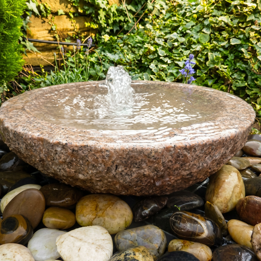 The Babbling Bowl Pink Granite Water Feature is a hand-carved natural stone fountain that creates a gentle bubbling water display in any garden setting.