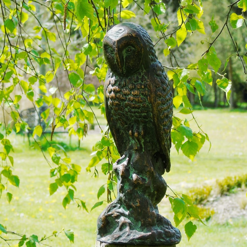 Hand-finished aluminium barn owl with aged bronzed patina, built to weather beautifully in any UK garden