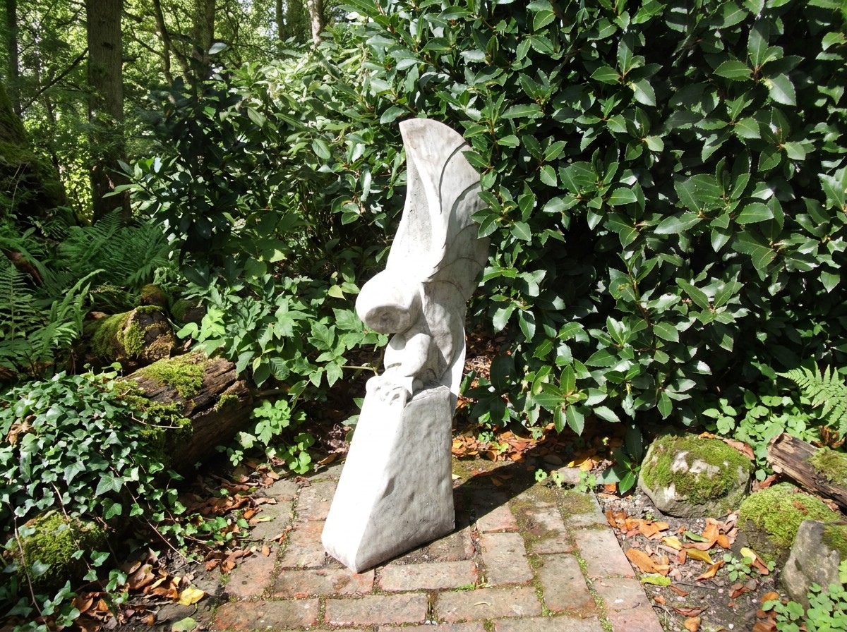 The swooping pose sets this owl apart from static perching designs. It creates a sense of movement and life, drawing the eye from across the garden. Position it among woodland planting, beside a shaded path, or at the edge of a wildlife garden.