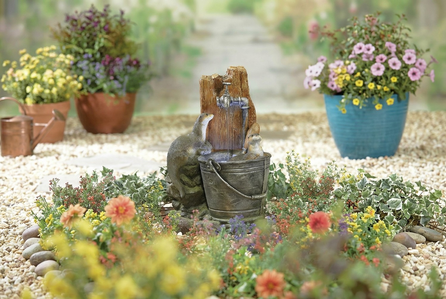 The Bathing Otters Self Contained Water Feature brings a playful wildlife scene to any garden. Two hand-finished otters interact with a rustic tap and bucket. Water cascades gently into the bucket below, creating a soothing trickling sound.
