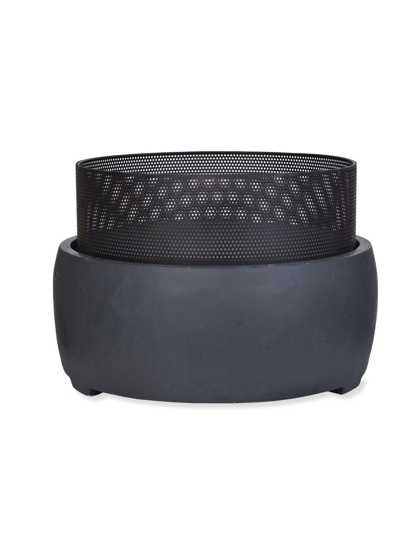 The Round Bould Outdoor Fire Pit has a Fibre Clay body with a Powder Coated Basket that sits inside it and patinas over time.