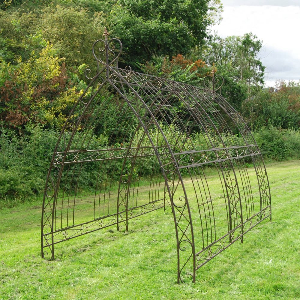 Antiqued bronze powder-coated steel garden tunnel standing over 3.3 metres tall with ornate Gothic arches