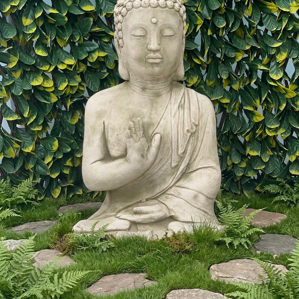 Standing 640mm tall on a 430mm square base, this statue suits garden borders, patio corners and dedicated meditation spaces. The natural stone finish blends with planting schemes and weathered surfaces. Over several seasons, the surface develops a gentle patina of moss and lichen that adds character.