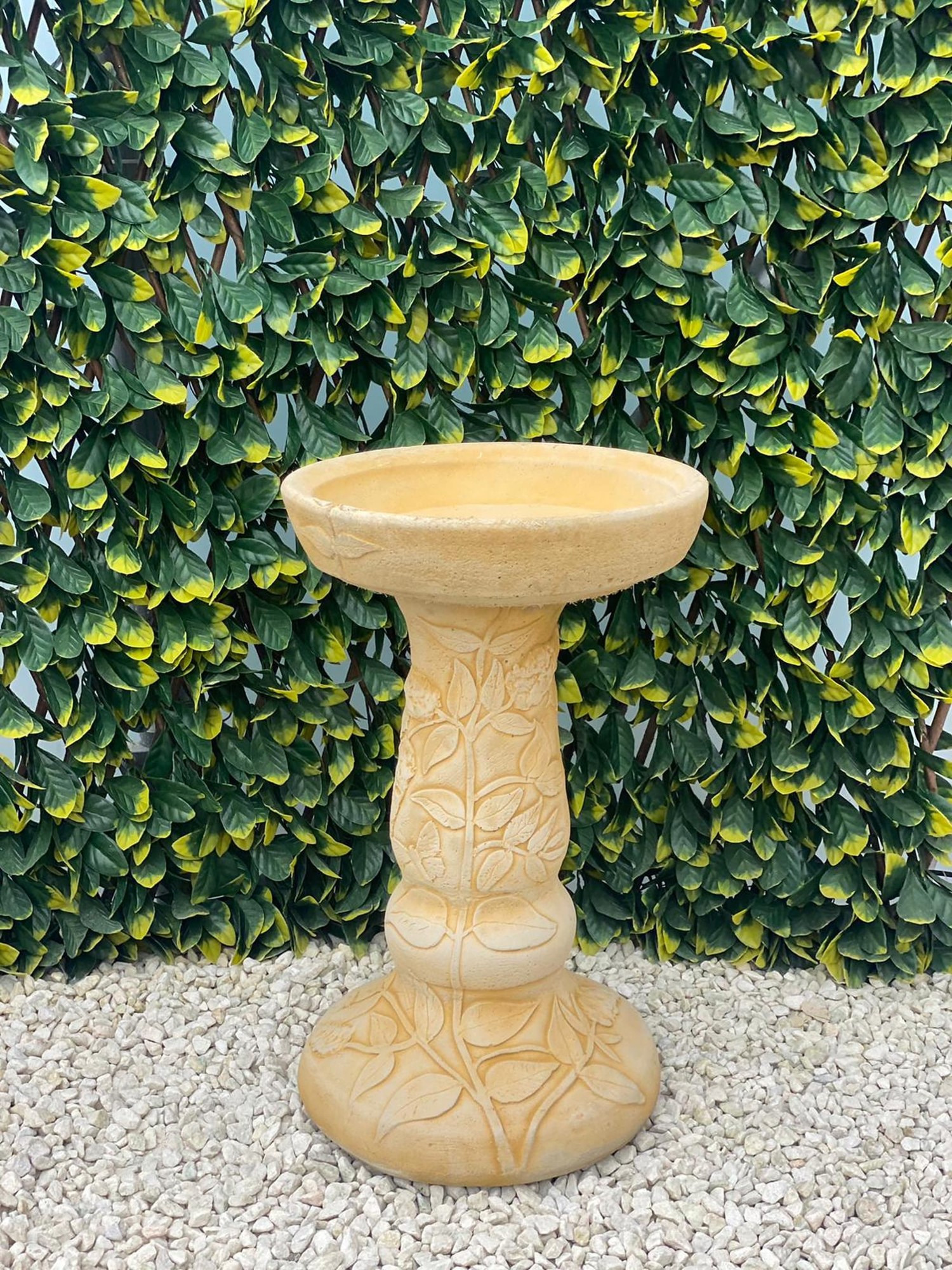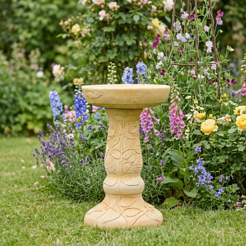 The Buddleia Birdbath in Sandstone brings a classic floral centrepiece to any garden. Its shallow bowl gives birds a safe place to drink and bathe all year round.