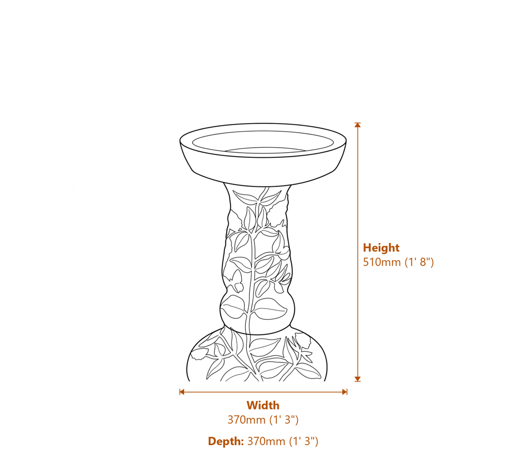 Standing 51cm tall with a 37cm wide bowl, this birdbath fits borders, patios, and lawn settings. At just 26kg, it stays stable without being too heavy to move.