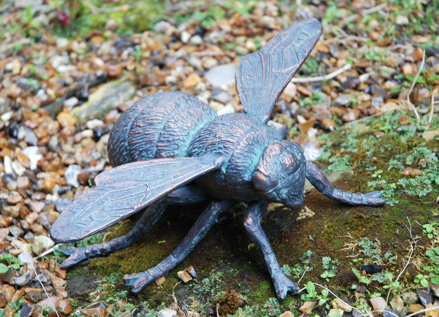 Cast from robust aluminium with an attractive aged verde finish, this compact Bumble Bee Metal Garden Statue measures H 9cm x L 21cm and weighs 1.4kg, perfect for placing on patios, rockeries, flower beds, or near a pond to add playful charm.