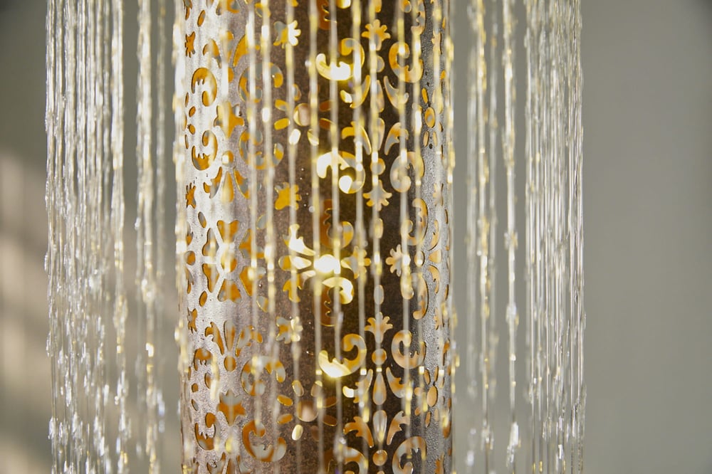 A striking 1120mm bronzed metal water feature with LED lighting, fret cut rainfall effect and plug-and-play setup