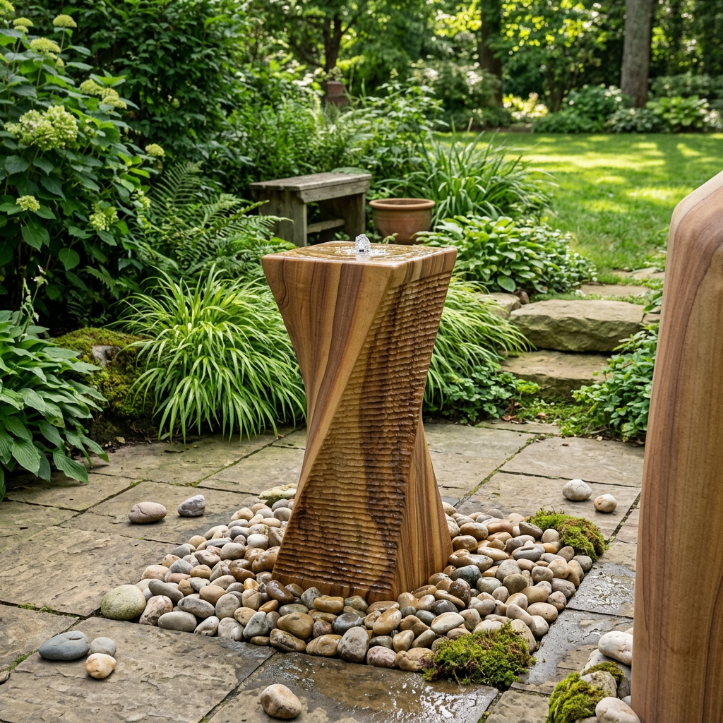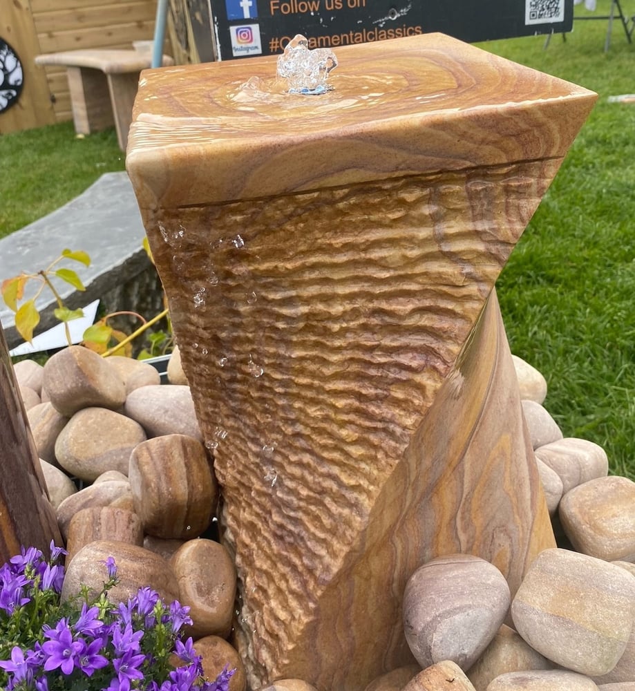 The Chubby Twisted Column Sandstone Water Feature is carved from genuine rainbow sandstone at £509. Water bubbles gently from the polished top and flows down the twisted column, catching the natural veining of the stone as it falls.