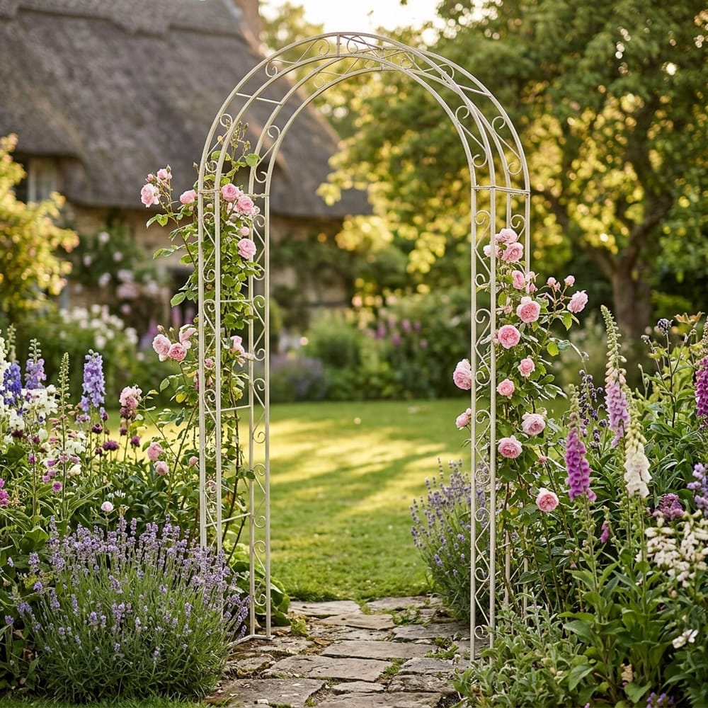 This Ascalon metal garden arch stands 2310mm tall and 1200mm wide. The antiqued cream finish gives it a vintage character that suits cottage gardens and traditional borders alike.
