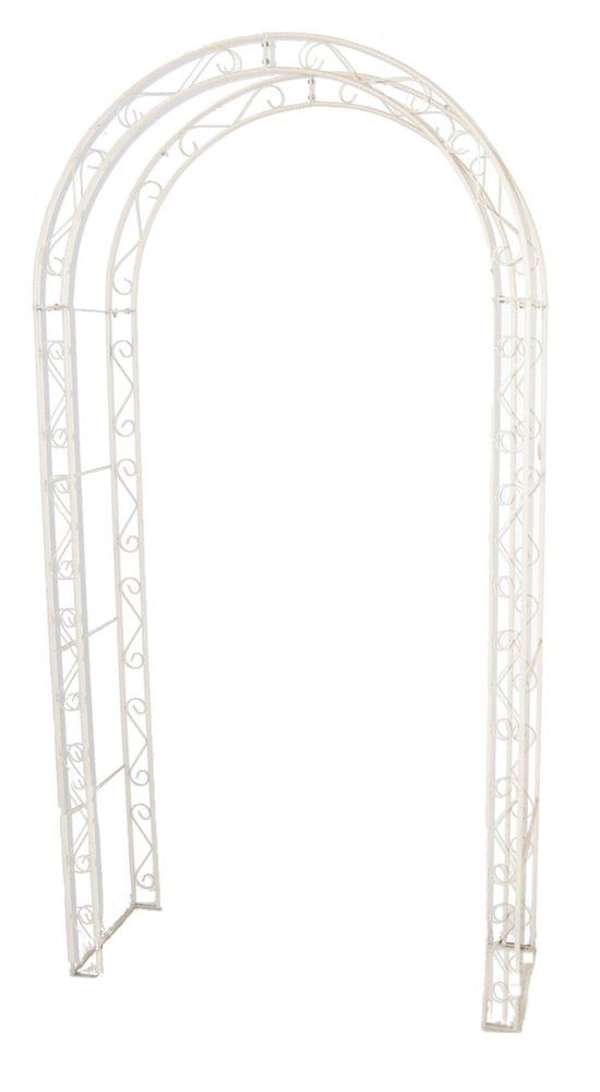 Antiqued cream powder-coated steel garden arch with ornate scrollwork, standing 2310mm tall