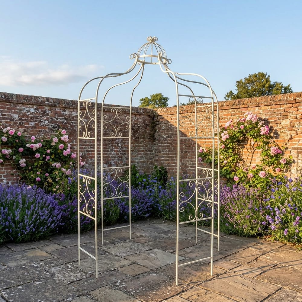 Antiqued cream powder-coated steel gazebo with vintage detailing, perfect for climbing plants