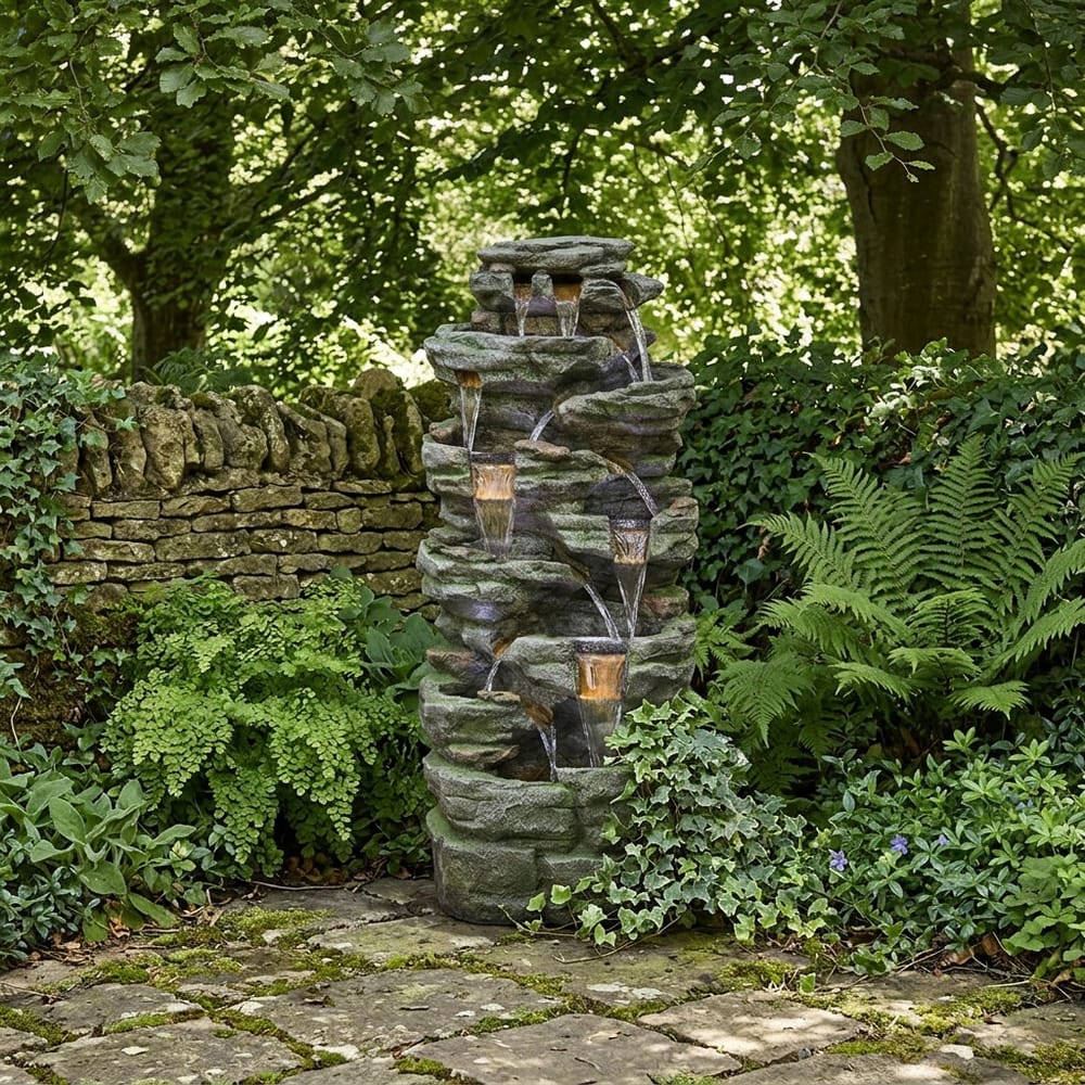 Warm LED lights are built into the tiers. They cast a soft amber glow across the water as it flows downward. This makes the fountain a genuine focal point after dark.