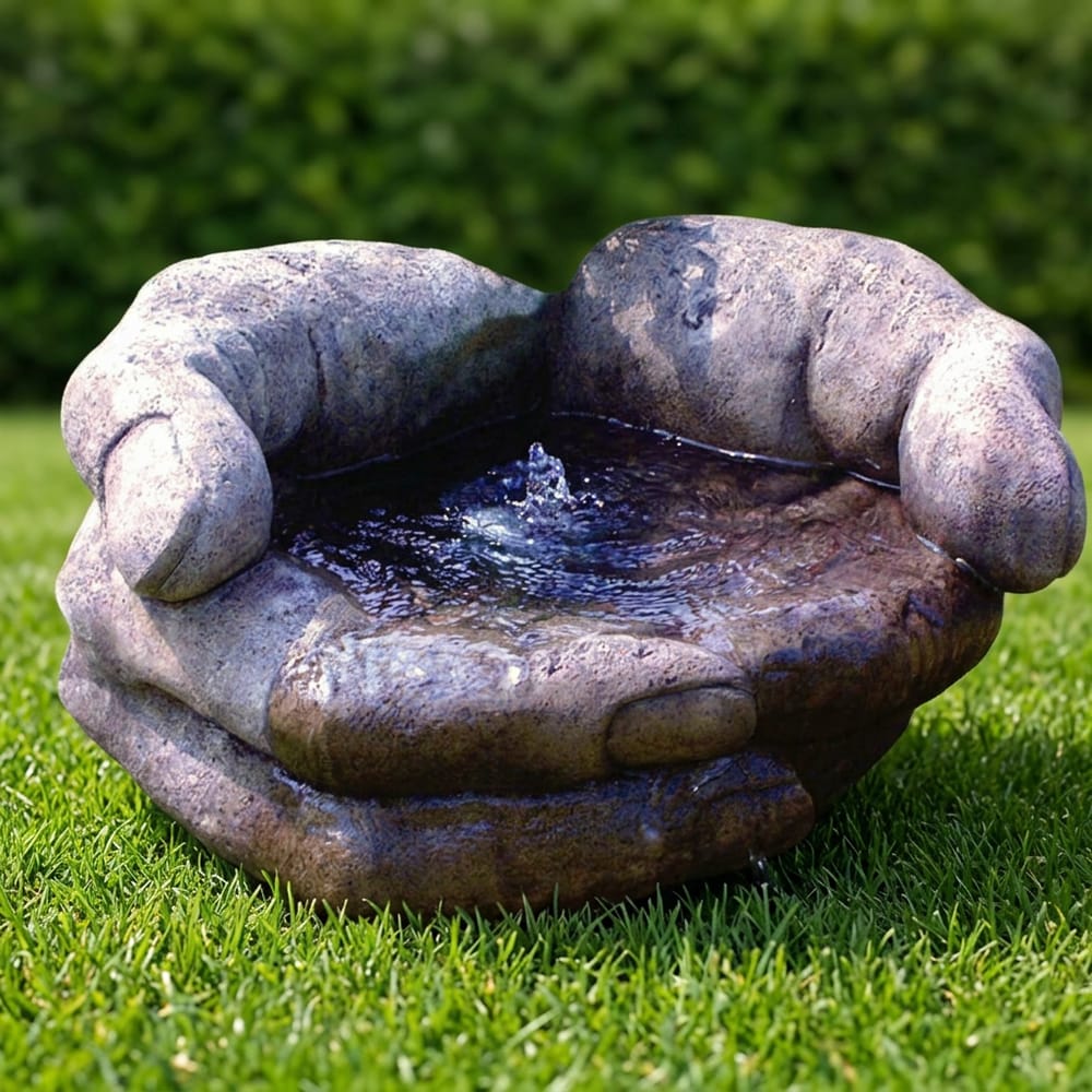 The Cupped Hands Stone Fountain brings a contemporary sculptural touch to any garden. Open palms cradle flowing water for a calming, natural display.