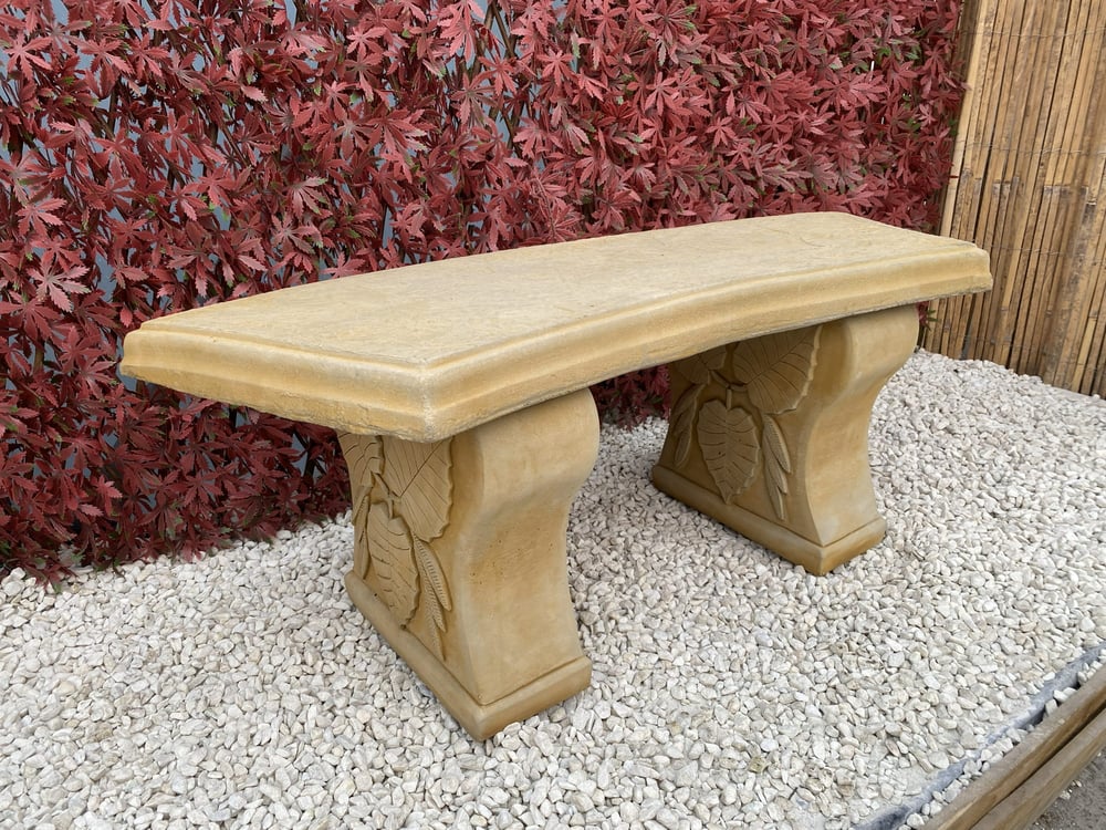 Handcrafted 110cm curved cast stone bench with decorative leaf legs and a warm sandstone finish