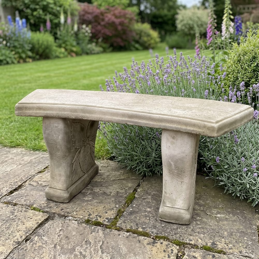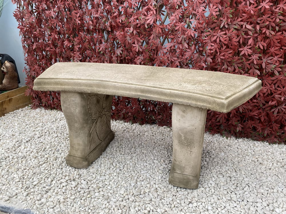 The Curved Leaf Stone Garden Bench is handcrafted from quality cast stone. It measures 1100mm wide, 300mm deep, and 430mm tall. Two sturdy legs support the curved seat, each decorated with sculpted leaf detail. The natural stone finish develops character as it weathers outdoors.