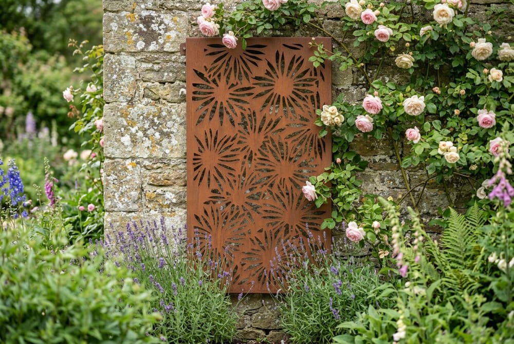 A 750mm steel garden screen with intricate daisy cut-outs that develops a natural rust patina or takes paint beautifully