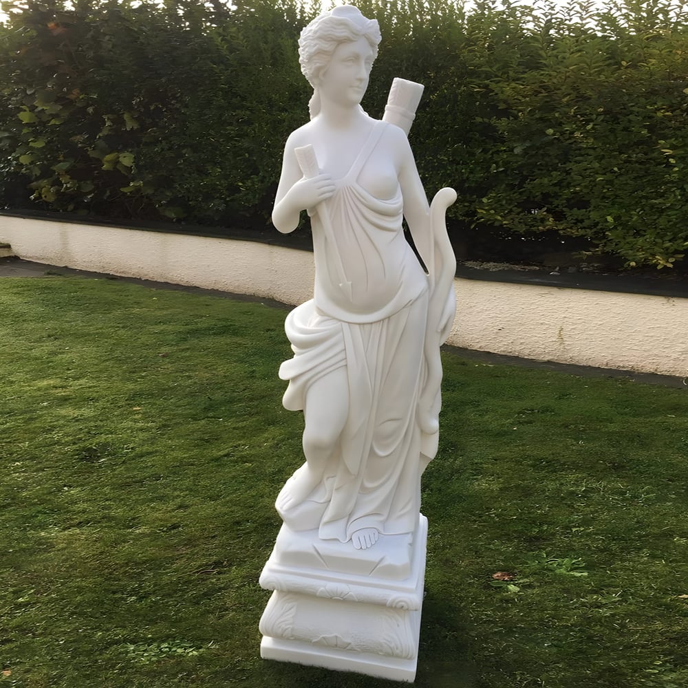 Inspired by ancient artistry, this decorative stone statue is hand-worked using a luxurious blend of crushed marble and high-quality resin. The result is a smooth, white Italian alabaster appearance that captures every intricate detail of the Extra Large Diana the Hunter Garden Statues form. Designed to withstand the elements, its frost-resistant finish ensures it remains a pristine focal point outdoors, while its flat base allows for easy, versatile placement on any patio, paving slab, or indoor surface. Whether placed in a serene garden nook or as a sophisticated indoor decor piece, this statue offers a perfect blend of durability and classical charm.