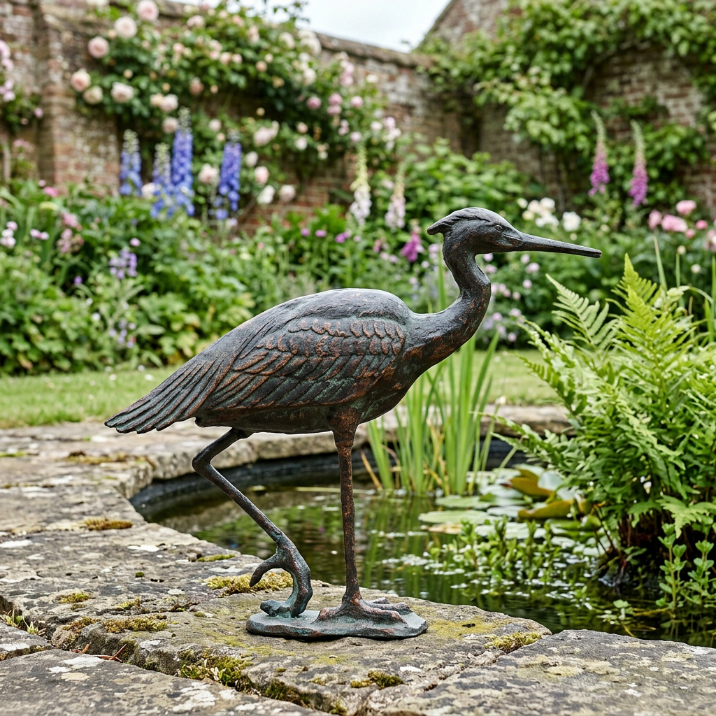 This hand-finished iron egret stands 290mm tall with an aged verde patina. It brings a touch of wildlife character to any garden setting.