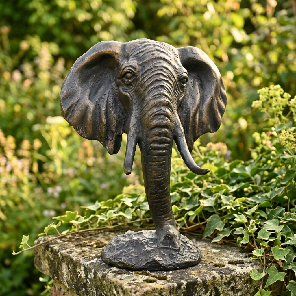 This Elephant Head Metal Garden Ornament brings African wildlife character to your garden, patio, or living space. Cast in aluminium with a hand-applied aged bronze and verde finish, it captures fine skin texture, expressive ears, and curved tusks.