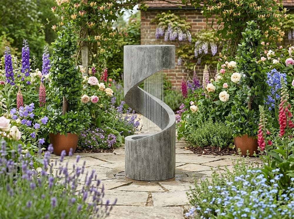 Water flows in a graceful spiral through the encapsulated column, catching the built-in LED light as it descends. The hand-finished detailing gives each piece a unique character. At 17.6kg, it is sturdy enough to stay in place year-round without being difficult to position.