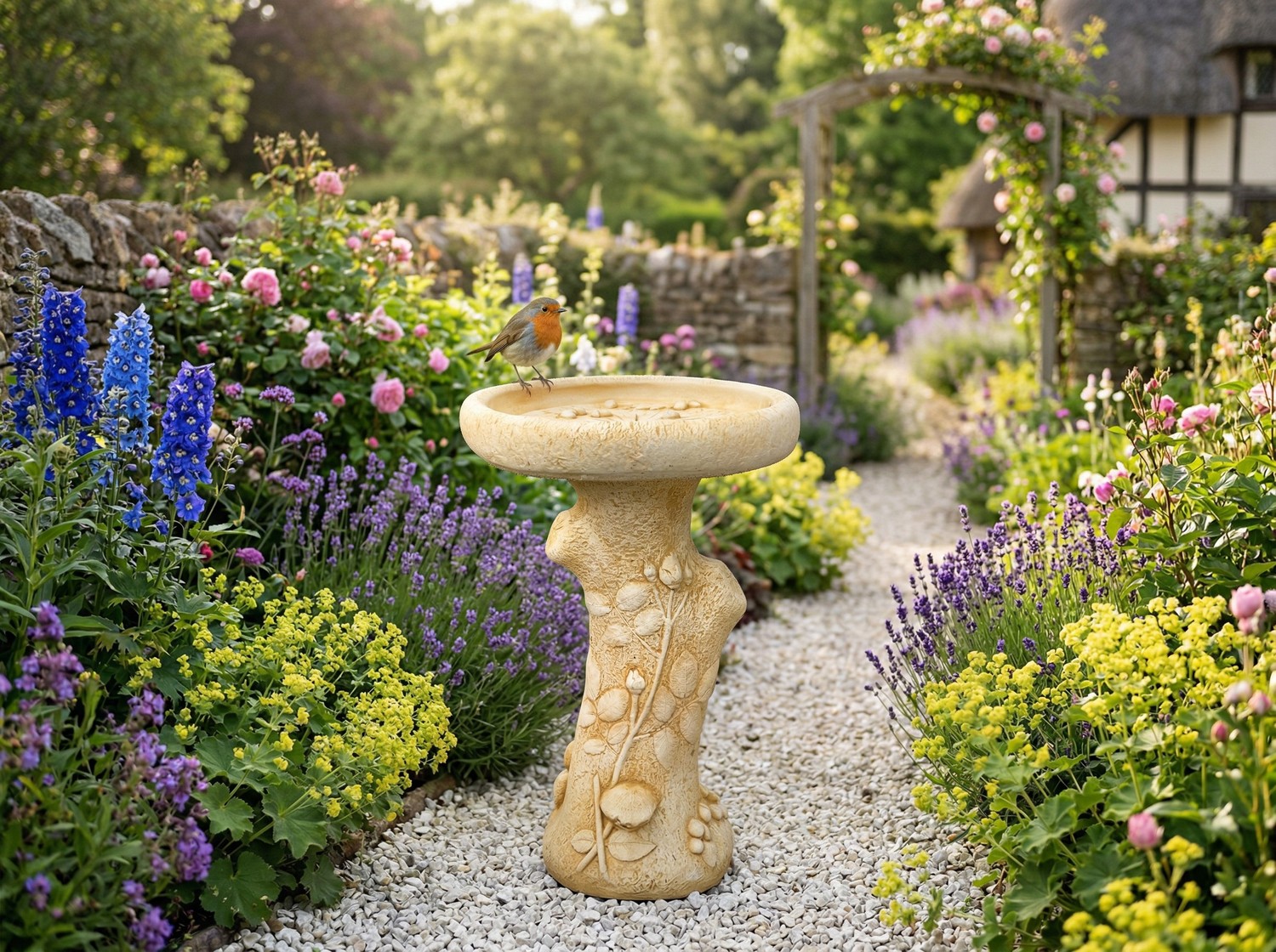 Beautifully detailed with a sculpted rose growing up the pedestal and a rustic log-effect bowl, this birdbath blends floral elegance with natural texture. The shallow basin provides a safe and inviting place for birds to drink and bathe, encouraging wildlife throughout the year. Carefully hand finished from high-quality cast stone, the piece displays crisp detailing and a refined surface. Finished in the Sandstone coating with its subtle yellow hues, it blends effortlessly into garden surroundings. Durable, frost-proof, and easy to maintain, the English Rose Birdbath creates a timeless focal point in both small and large gardens.