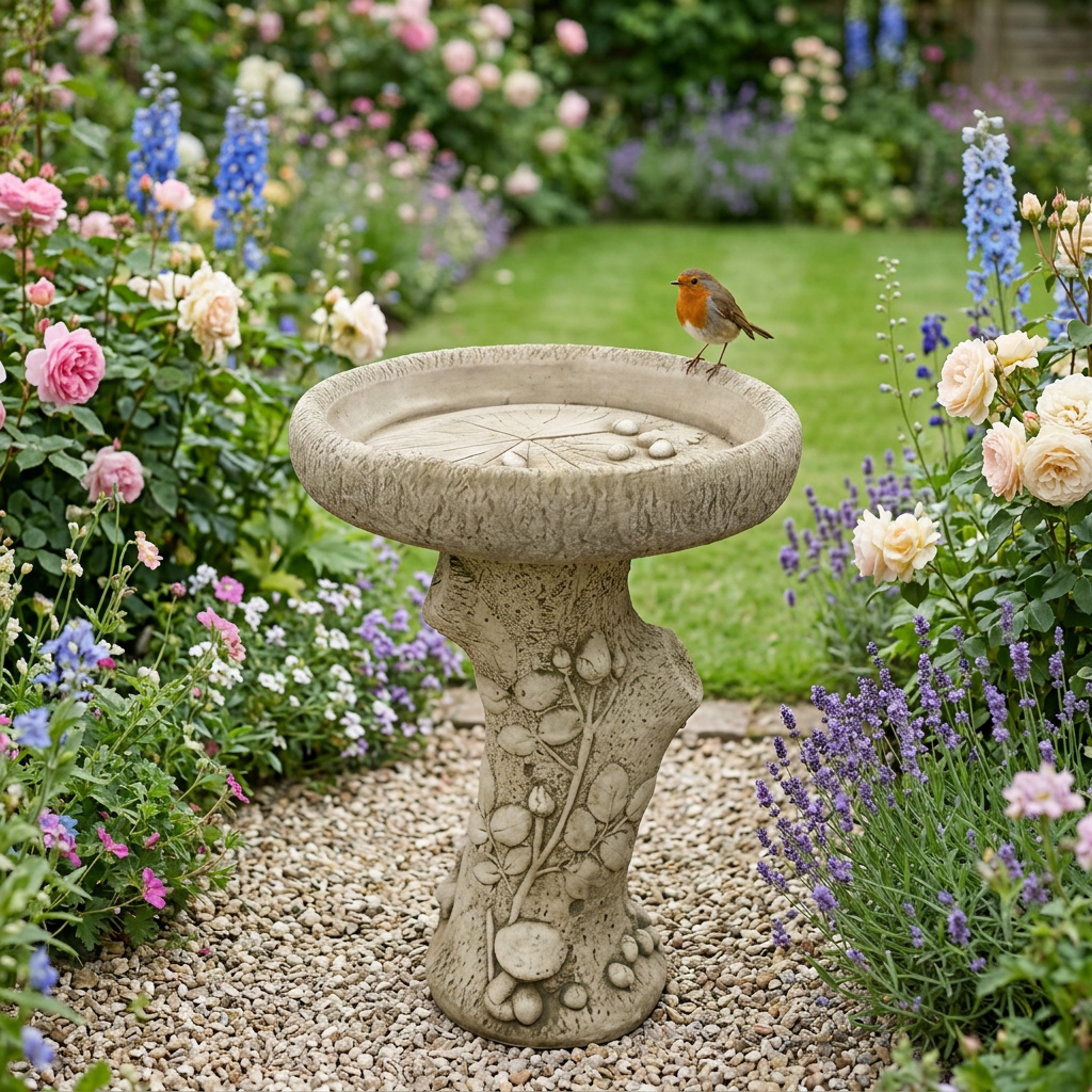 The English Rose Birdbath stands 560mm tall on a decorative pedestal wrapped in sculpted climbing roses. The shallow bowl sits on a rustic log-effect column, giving it a natural woodland look.