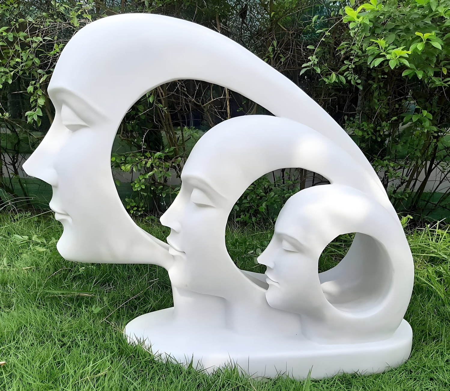 The Evolution Garden Statue in White features three graduated face profiles arranged in a flowing wave pattern. Standing 70cm tall, this striking piece makes a bold focal point in any garden.