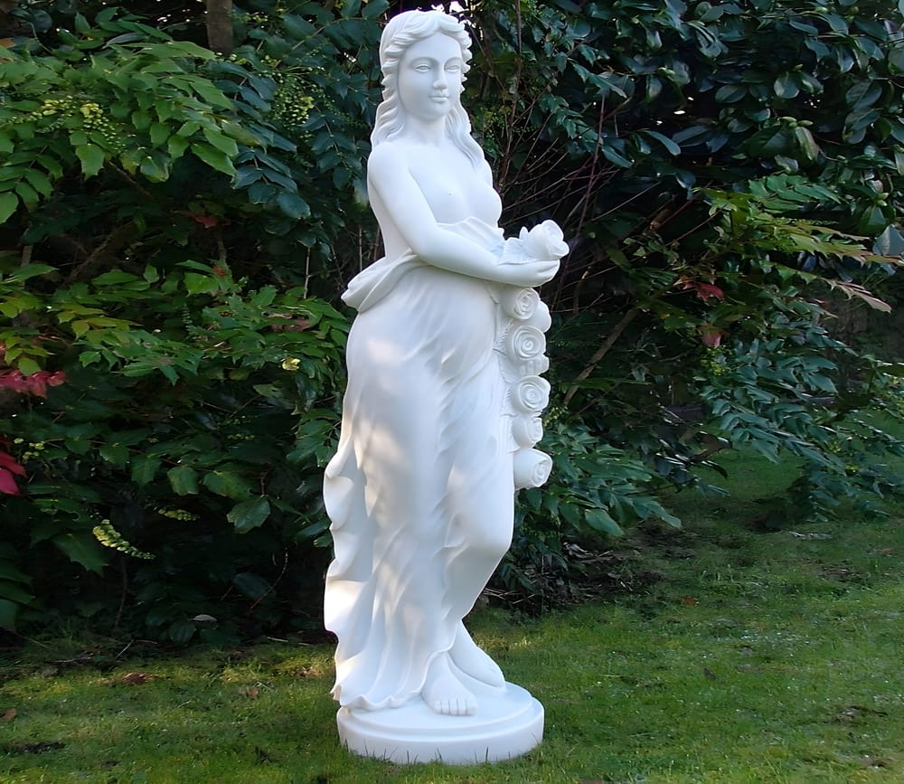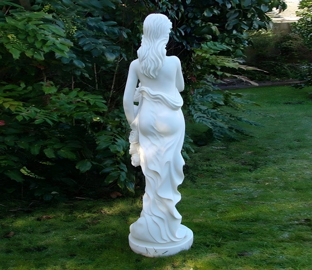 This statue is handmade from a blend of crushed marble and high-grade resin. The result is a smooth, pure white alabaster finish with genuine weight and presence. Each piece features a cascading trail of roses, hand-refined by skilled craftsmen at the Enigma workshop. The attention to detail is visible in every fold of the drapery and petal.