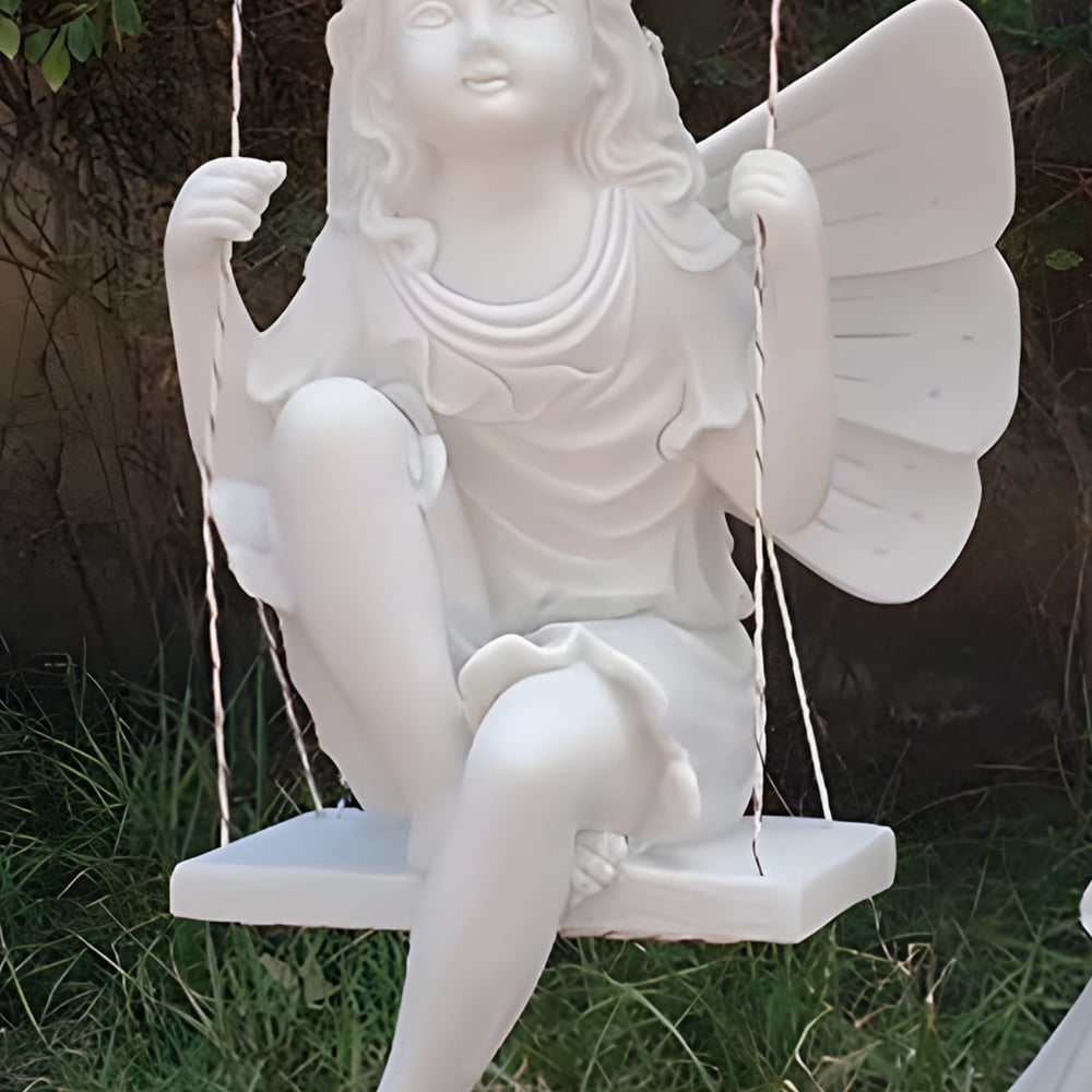 Hand-refined, this substantial Fairy on a Swing Garden Statue features an elegant fairy suspended from a delicate swing under a beautifully textured, flower-adorned tree arch. Cast from a heavy-duty crushed marble and resin composite, it offers a gallery-grade alabaster appearance that is incredibly robust; the frost-resistant materials ensure that the fine details, from the individual flower petals on the branches to the fairyâs intricate wings remain protected and pristine through even the harshest winter weather.