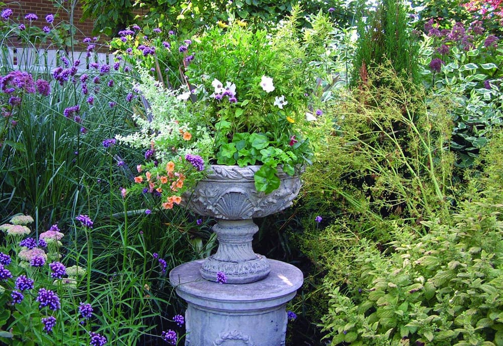 A handcrafted cast stone garden vase with a shell motif and scroll detail in Aged Cotswold or Burnt Umber