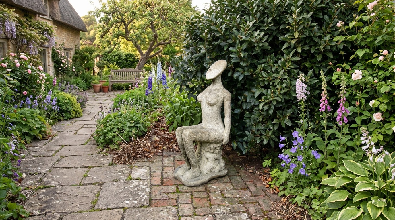 This seated figure wears a wide-brimmed hat and captures a moment of quiet contemplation. Each statue is individually cast, giving it a unique aged appearance from day one. The textured stone surface encourages moss and lichen growth, adding natural character with every passing season.