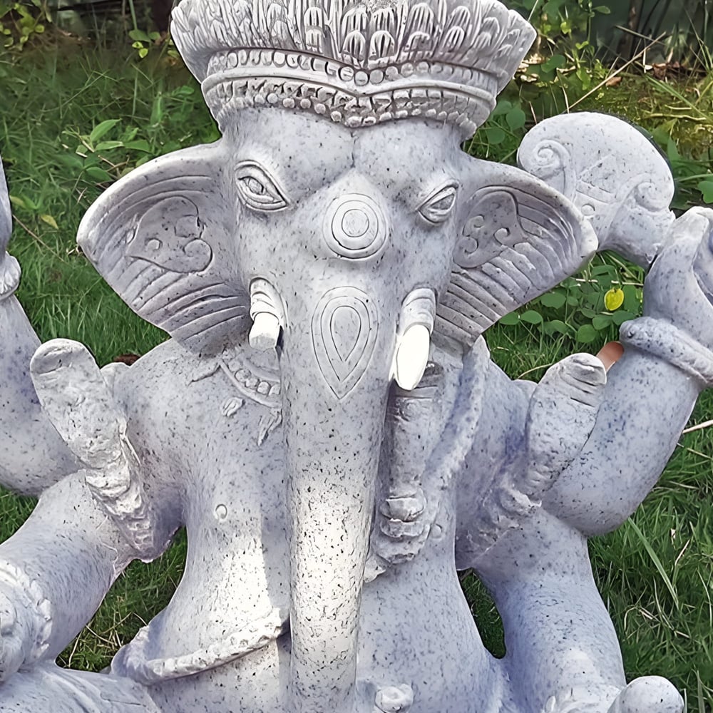 Hand-finished to ensure gallery-grade detail, this Ganesha Garden Statue in Granite is cast from a robust granite and marble composite that captures the luxurious, cold-to-the-touch sensation of authentic Italian stone. The design showcases the deity in a traditional pose with meticulous carvings across the crown, trunk, and multiple arms, as seen in the detailed imagery.