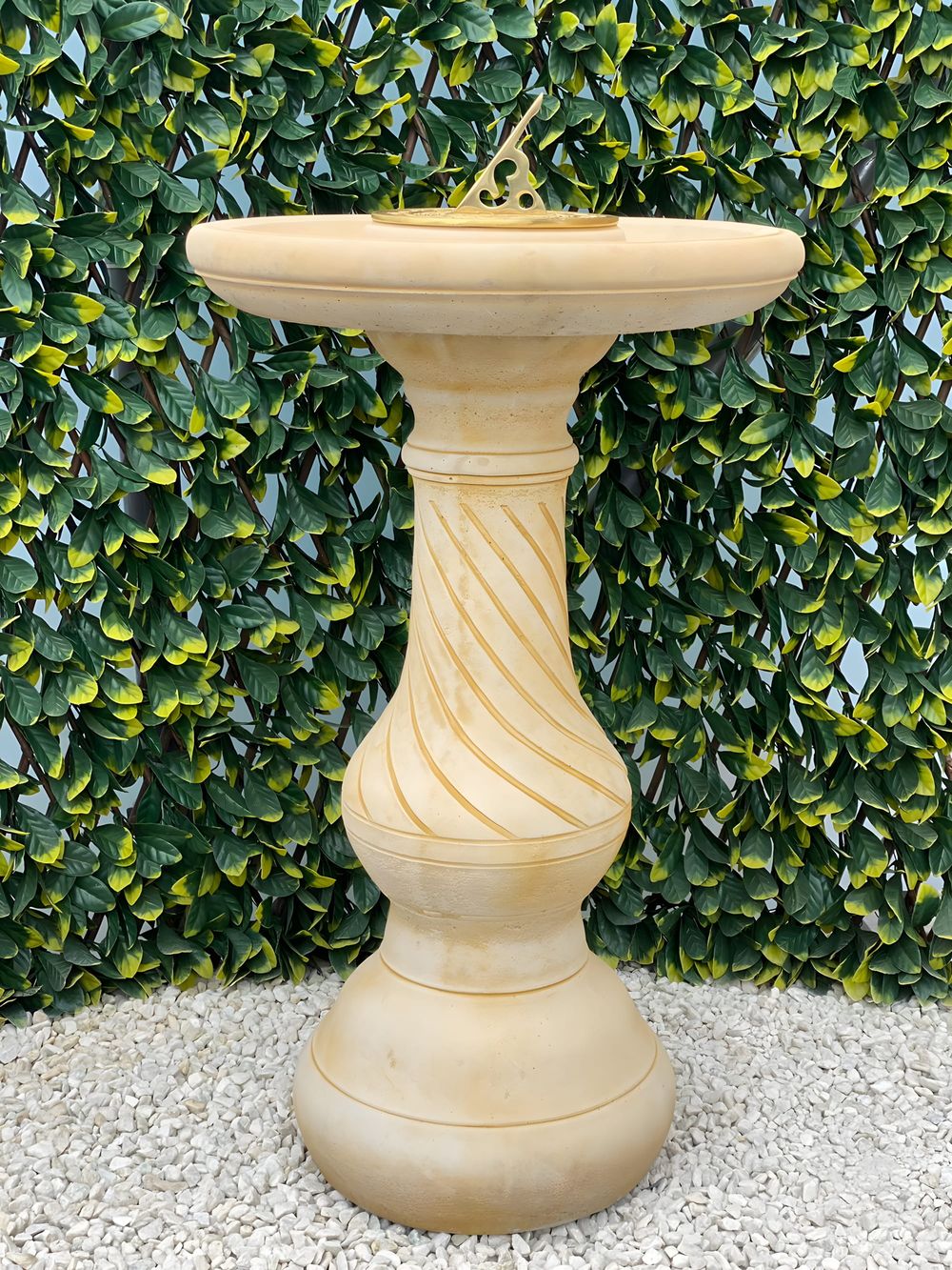 Standing 780mm tall, this sundial is hand-finished from quality cast stone in a warm sandstone tone. The spiral column draws the eye upward to the solid brass sundial plate, which sits within a 480mm diameter bowl. Birds quickly discover the shallow water that collects after rain, making it a year-round wildlife feature.