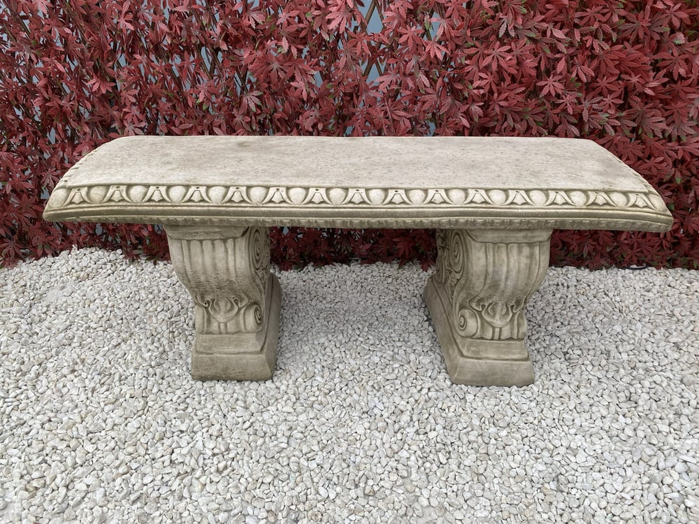 Each bench is hand-finished from quality cast stone. The two scroll-shaped legs feature carved volute and acanthus detailing. Along the seat edge, traditional egg-and-dart moulding adds a refined Gothic character.