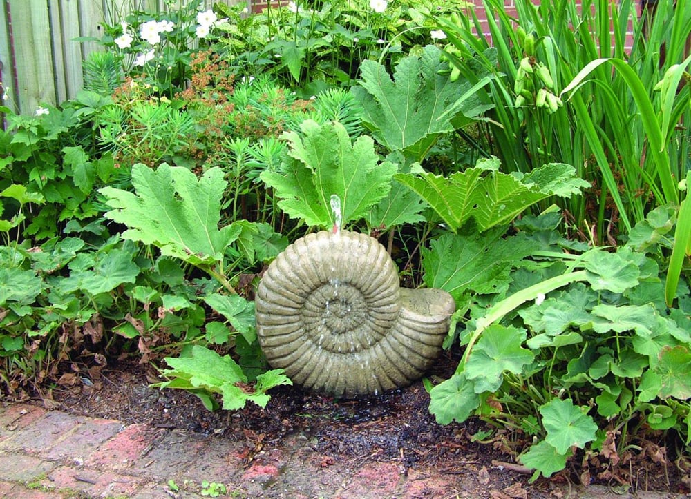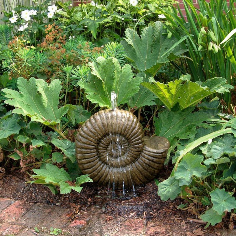 The Grand Ammonite Stone Fountain features a striking spiral shell design inspired by fossilised ammonites. It brings a natural, ancient feel to any garden setting.
