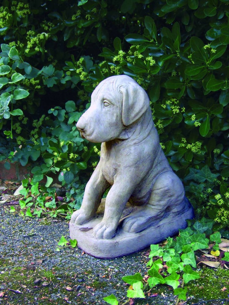 Handcrafted cast stone Great Dane puppy with aged patina, available in Cotswold or Burnt Umber