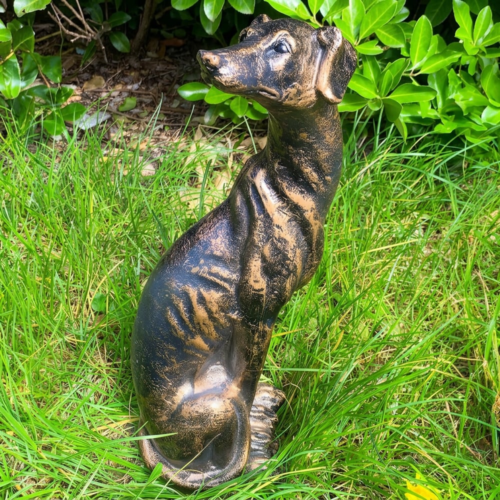 A 55cm frost-resistant greyhound statue in bronze finish, cast from crushed marble and resin