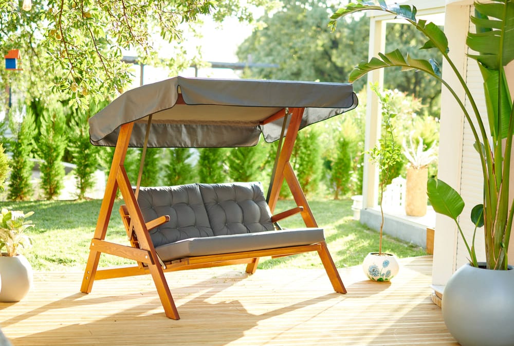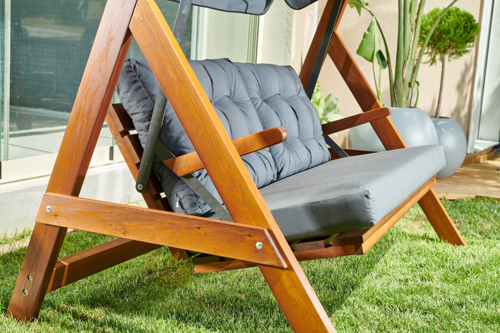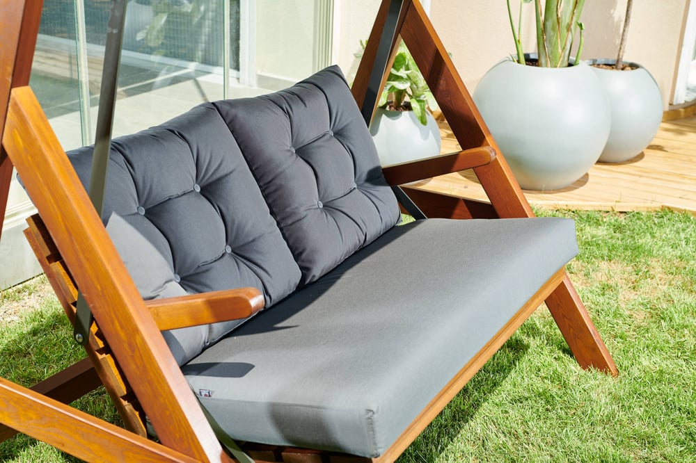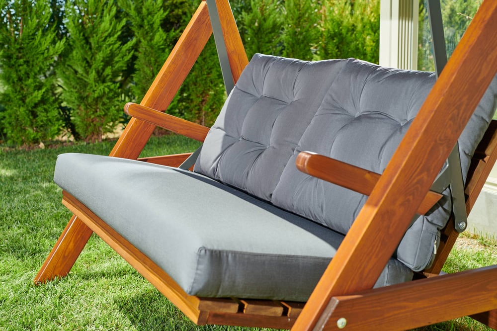 The Sandringham 2000 Wooden Garden Swing Seats thick frame is made from Europen Pinewood and lightly oiled to give a dark finish. Cushions and the canopy are both hardwearing Polyester.