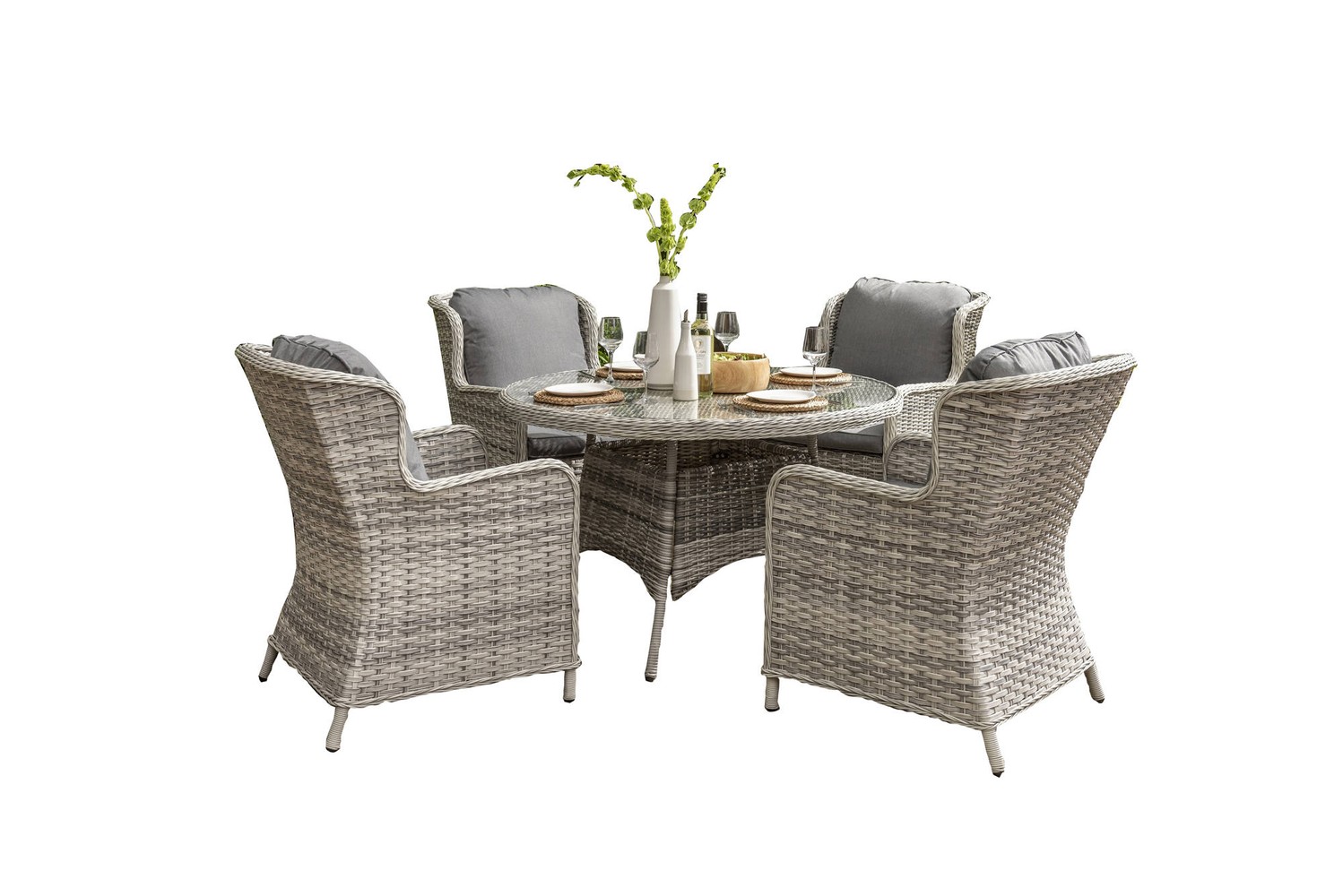 The Handpicked Wroxham 4 Seat Dining Set is a great choice for those who want to enjoy their garden to the fullest. The set comes with a round 120cm table, with 5mm tempered proof glass, and 4 dining chairs. The chairs are made of Durable Rattan, which is resistant to both UV rays and moisture.