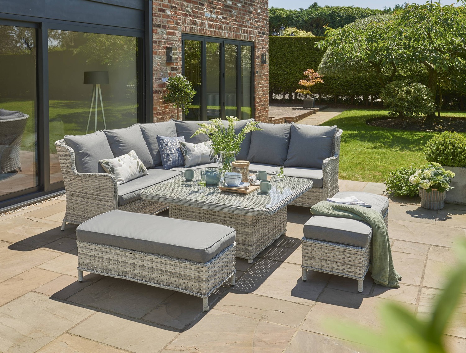 The Handpicked Wroxham Large Corner Seat Set with Gas Adjustable Table is a modern and practical addition to any outdoor space. The set includes a corner piece, a bench left and right, an extension, two large stools, and a gas adjustable coffee table. The chairs are made of Durable Rattan, which is resistant to both UV rays and moisture.