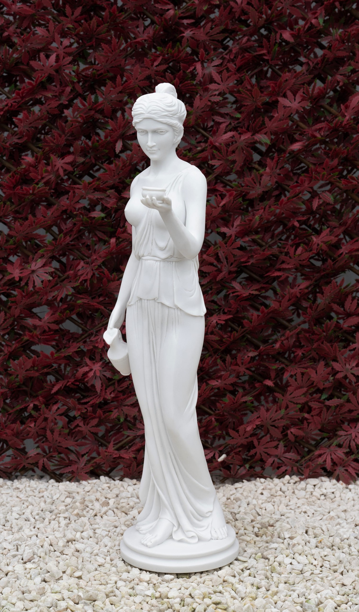 In ancient Greek mythology, Hebe was the goddess of youth and cup bearer to the gods of Mount Olympus, modestly draped as she served. This outstanding reproduction is handcrafted from pure white terrazzo marble using crushed marble and resin, faithfully capturing the artistâs original vision with beautifully crisp detail. Available in two sizes and finished in a smooth alabaster white, the Hebe Goddess Garden Ornament is durable, easy to maintain, and perfectly suited to formal and cottage gardens, patios, terraces, balconies, or elegant indoor settings.