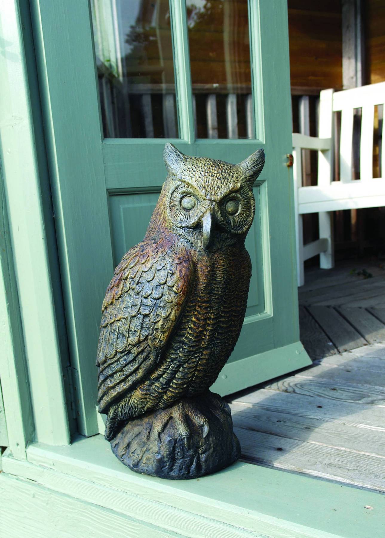 The Horned Owl Statue features authentic feather detailing.