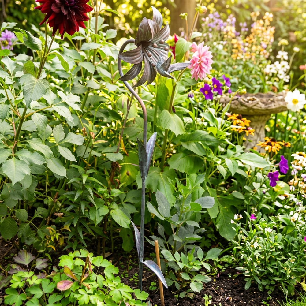 A 1200mm hand-finished bronzed iron hummingbird ornament with aged verde patina, ideal for garden borders and patio displays.